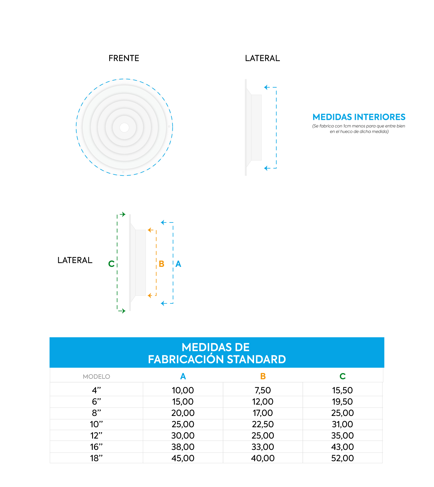 Además, cuentan con salidas para conductos en varios diámetros: 10 cm, 15 cm, 20 cm, 25 cm y 30 cm, permitiendo flexibilidad y personalización según las necesidades específicas de cada instalación.