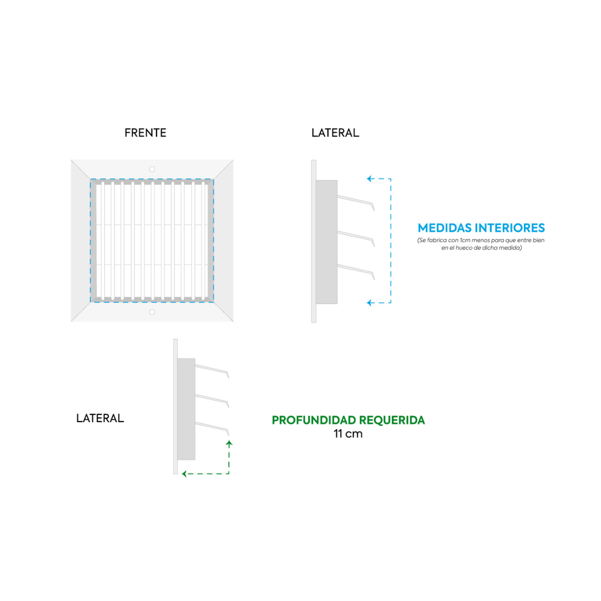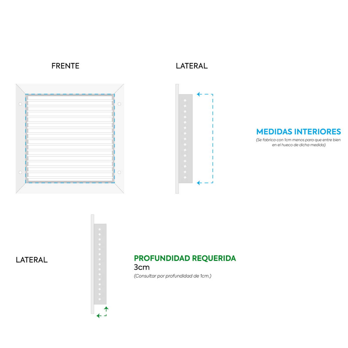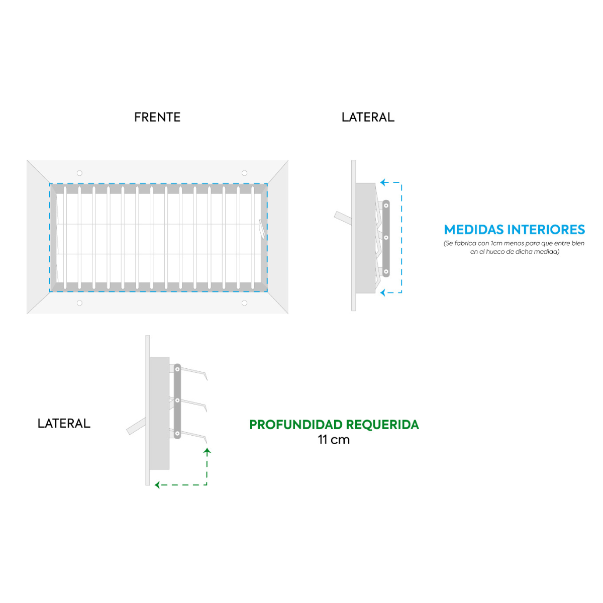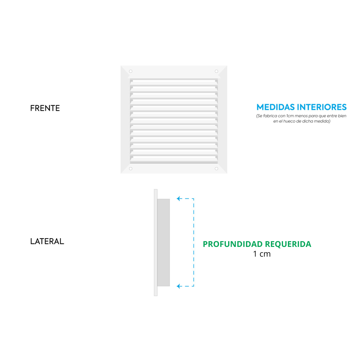 Recorda que al solicitar tus Rejillas, debes indicarnos las medidas interiores más marco (Base x Altura) para asegurarte de que se ajusten perfectamente a tu instalación.